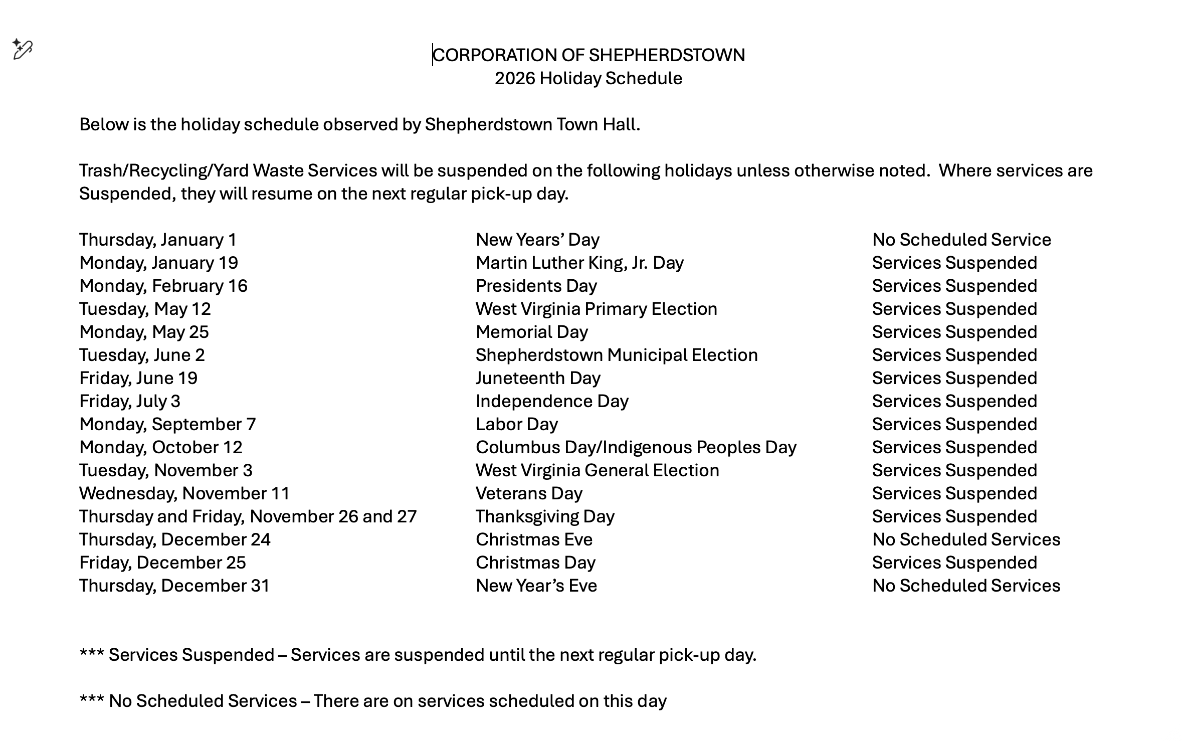 2026 Shepherdstown Holiday Schedule for Trash/Recycling/Yard Wast Services